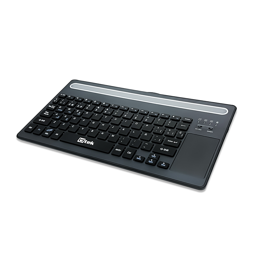 Este Teclado Inalámbrico con Touchpad Bluetooth 5.0 y 2,4Ghz modelo UT-KBBT900P, cuenta con un diseño elegante y funcional con una ranura integrada para colocar tablet o smartphones. Además, cuenta con un área táctil. Incluye su cable micro USB para su recarga.
