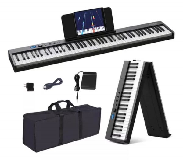 Piano portátil y plegable: el teclado de piano plegable se puede plegar 180°, ahorra mucho espacio y es fácil de llevar. Viene con una bolsa de viaje portátil, que se puede proteger bien y almacenar. El tamaño es de 24.5 x 8.5 x 4.5 pulgadas, el peso solo pesa 8.93 libras. Puedes llevarlo a cualquier lugar y en cualquier momento que desees, disfrutar de la música con familiares o amigos